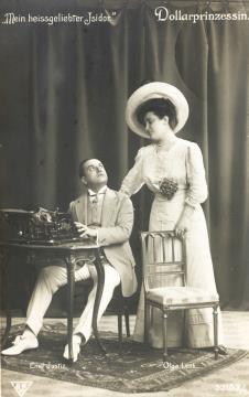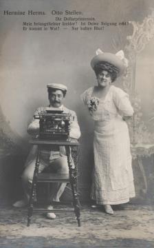 Illustrierte Postkarte; Fotografie, monochrom Rückseite: Rollenporträt aus der Operette "Die Dollarprinzessin"; Schauspieler Hermine Herma und Otto Stellen mit Schreibmaschine, Textzeile aus dem Stück: Mein heissgeliebter Izzidor! [...] Vorderseite nicht beschrieben