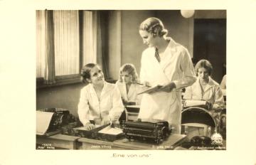 Illustrierte Postkarte; Fotografie, monochrom; Ross Verlag Nr. 156/2; Rückseite: Standfoto aus dem Film "Eine von Uns" (1932); Schauspielerinnen Jessie Vihrog und Brigitte Helm mit Schreibmaschine Vorderseite nicht beschrieben