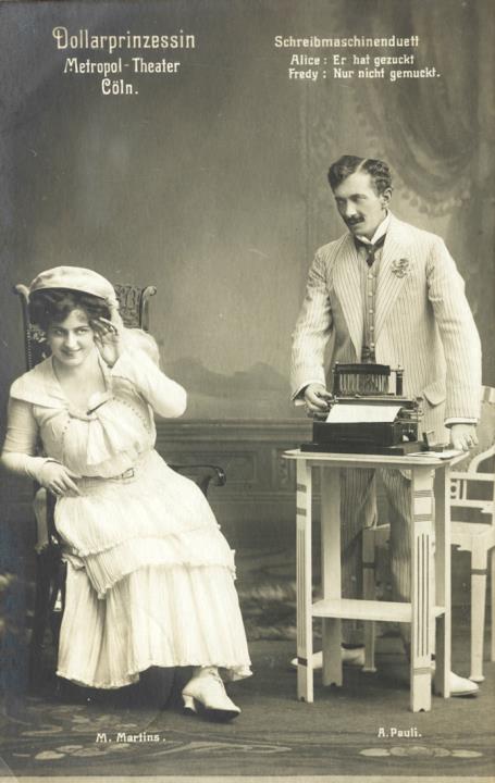 Illustrierte Postkarte; Fotografie, monochrom Rückseite: gestelltes Szenenfoto aus der Operette "Die Dollarprinzessin"; Schauspieler M. Martins und A. Pauli (Alice/Fredy) mit Schreibmaschine, Text: Schreibmaschinenduett [...] Vorderseite: adressiert an Herrn Kluth, Crefeld; Briefmarke Deutsches Reich 5 Pf., Poststempel Mühlheim/11.08.1909