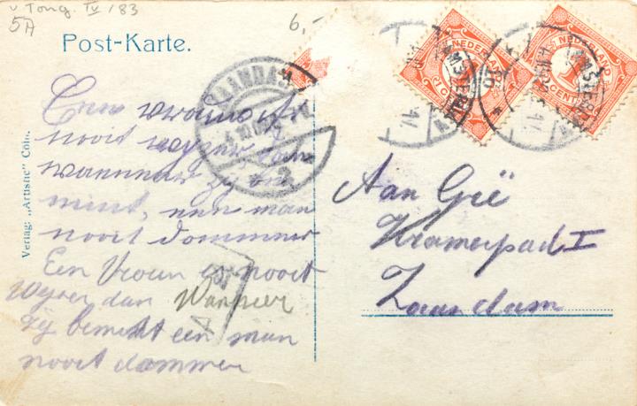 Illustrierte Postkarte; Fotografie, koloriert Rückseite: gestelltes Szenenfoto aus der Operette "Die Dollarprinzessin"; Schauspieler M. Martins und A. Pauli (Alice/Fredy) mit Schreibmaschine, Text: Nachspiel zum Schreibmaschinenduett Vorderseite: adressiert an Aan Grë, Zaandam; Briefmarke Nederland 1 Cent; Poststempel Zaandam/4.10.1909