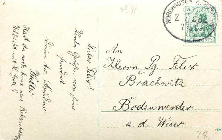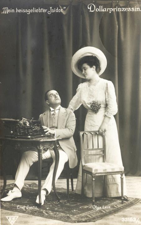 Illustrierte Postkarte; Fotografie, monochrom; BNK Nr. 33163/1 Rückseite: gestelltes Szenenfoto aus der Operette "Die Dollarprinzessin"; Schauspieler Olga Lenk und Emil Justiz (Alice/Fredy) mit Schreibmaschine, oben rechts Textzeile aus dem Stück: Mein heissgeliebter Isidor. Vorderseite: beschrieben; adressiert an Herrn Brachnitz, Bodenwerder; Briefmarke Deutsches Reich 5 Pf.; Poststempel Nordhausen/7 5 1909