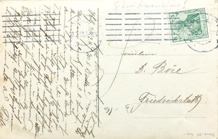 Illustrierte Postkarte; Fotografie, monochrom; Nr. 2267/6 Rückseite: gestelltes Szenenfoto aus der Operette "Die Dollarprinzessin"; Schauspielerin und Schauspieler mit Schreibmaschine, oben rechts Textzeile aus dem Stück: So darf ich vernichten das Briefchen sofort [...] Vorderseite: beschrieben; adressiert an Fräulein Böre, Friedrichstatt; Briefmarke Deutsches Reich 5 Pf.; Poststempel unleserlich