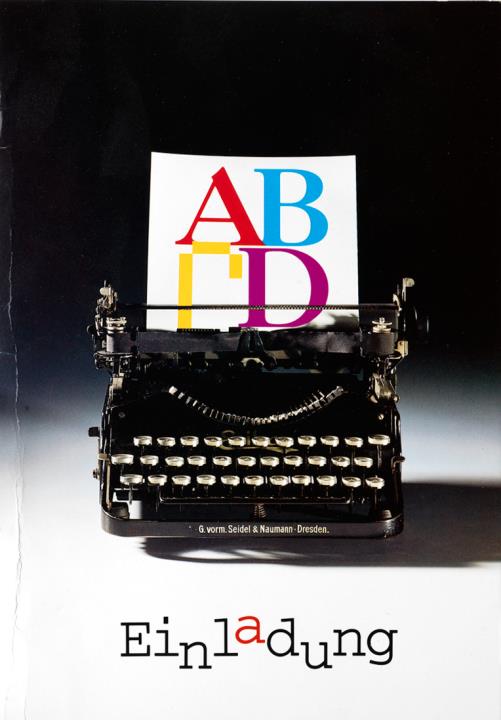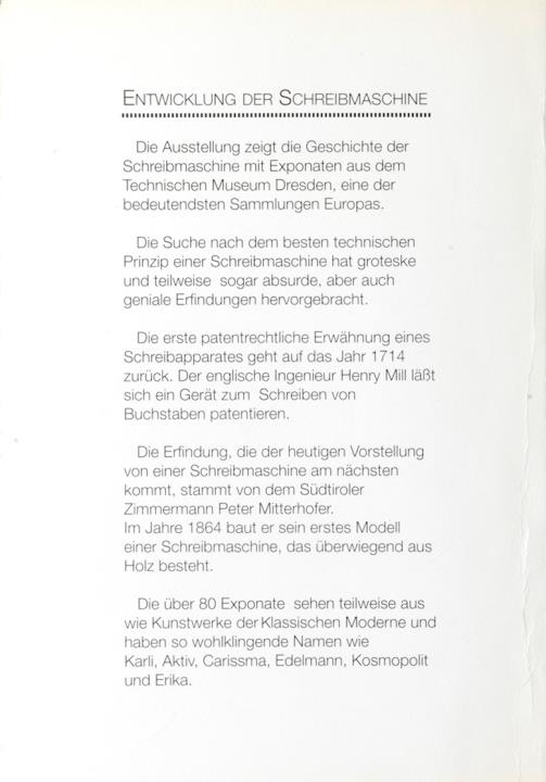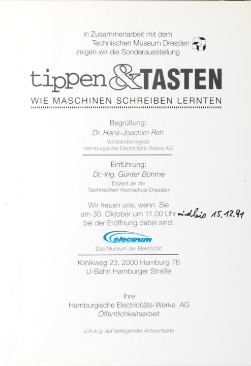 Einladungskarte; Grafik, Fotografie, polychrom Vorderseite: Schreibmaschine Seidel & Naumann Innenteil: Text zur Entwicklung der Schreibmaschine; Einladung zur Ausstellungseröffnung "tippen &Tasten. Wie Maschinen schreiben lernten", in Zusammenarbeit mit dem Technischen Museum Dresden, 30.10.1991, Museum für Elektrizität electrum, Hamburg
