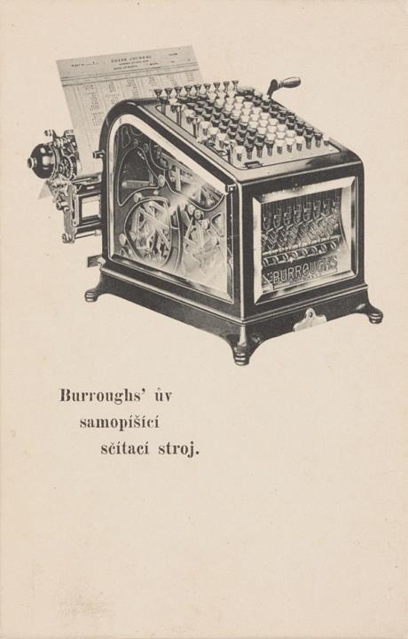 Werbepostkarte; Grafik, monochrom Rückseite: Rechenmaschine Burroughs Vorderseite nicht beschrieben