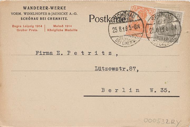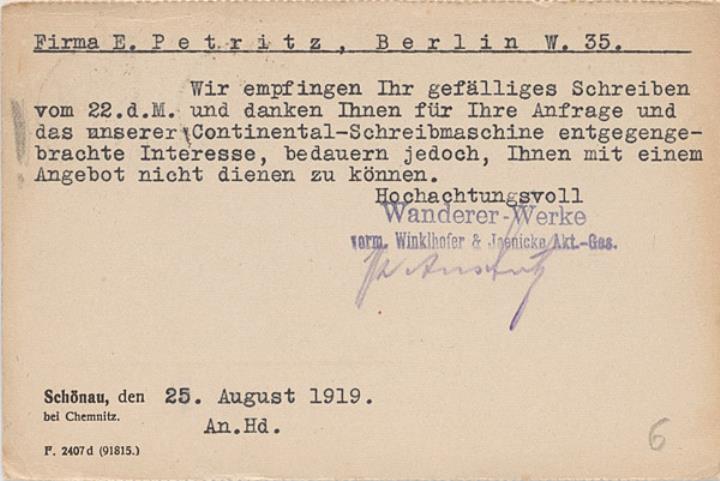 Postkarte mit Firmendruck; monochrom Vorderseite: adressiert an Firma Petritz, Berlin; Briefmarke Deutsches Reich 7 1/2+2 1/2 Pf.; Poststempel Schönau/25.8.1919 Rückseite beschrieben (Maschinenschrift)
