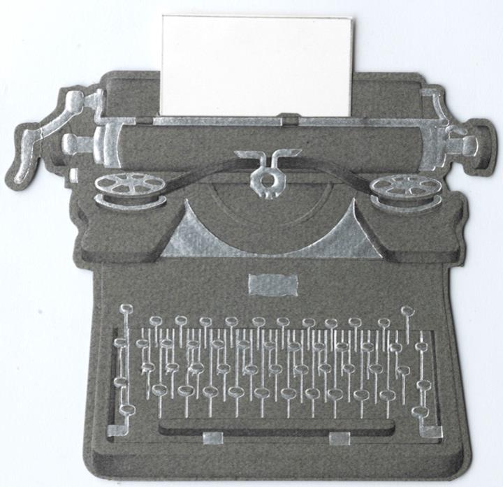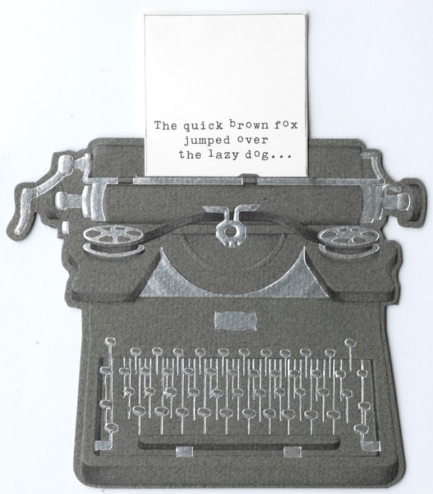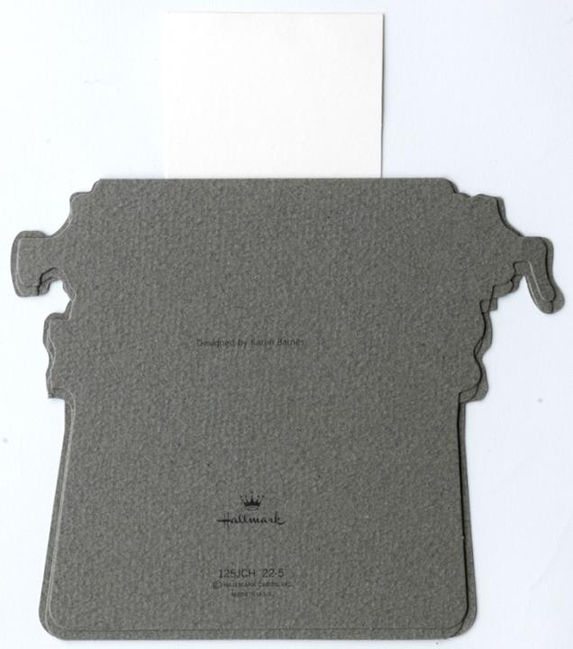 aufklappbare Grußkarte; Grafik, polychrom; Nr. 125JCH 22-5 Karte in Form einer Schreibmaschine, herausziehbares Blatt Papier mit Text: The quick brown fox jumped over the lazy dog...