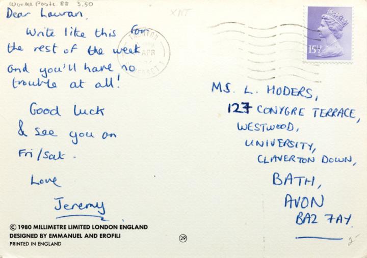 Illustrierte Postkarte; Grafik, polychrom; Grafik: Emmanuel and Erofili Rückseite: Schreibmaschine Vorderseite: beschrieben, adressiert; Briefmarke UK Mail 15 1/2 p; Poststempel Taunton/24 Apr 1982
