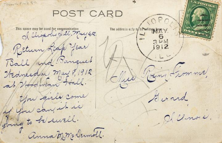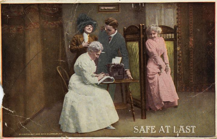 Illustrierte Postkarte; Grafik, Fotografie; polychrom copyright 1909 Roth & Langley, N.Y. Rückseite: Mann und drei Frauen mit Schreibmaschine Vorderseite: beschrieben und adressiert; Briefmarke U.S. Postage One Cent; Poststempel Illiopolis/May 6 1912