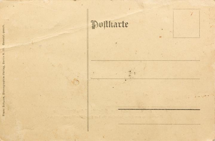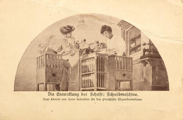 Illustrierte Postkarte; Grafik, monochrom Rückseite: Büroszene; zwei Frauen mit Schreibmaschine und Telefon; Text: Neue Lünette von Hans Koberstein für das Preußische Abgeordnetenhaus Vorderseite nicht beschrieben