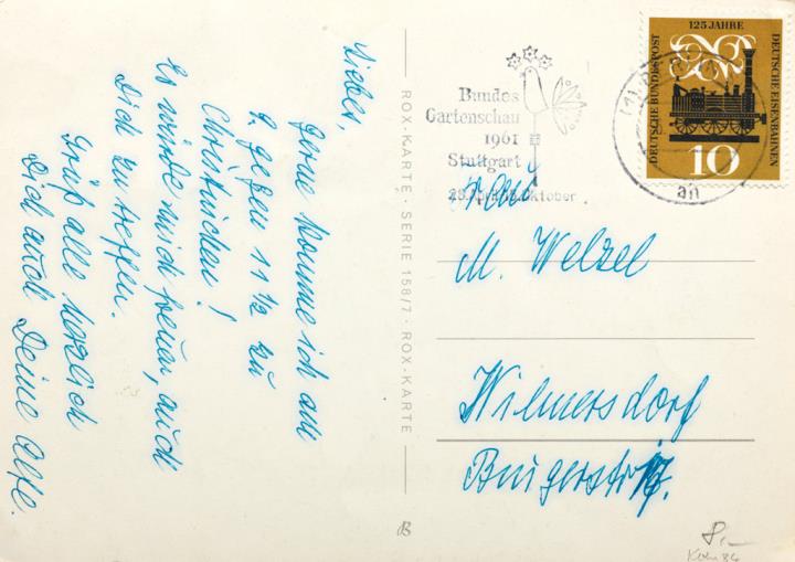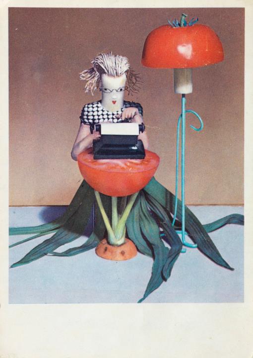 Illustrierte Postkarte; Grafik, polychrom; Rox-Karte Serie 158/7 Rückseite: aus Gemüse gerfertigte Figur mit Schreibmaschine Vorderseite: beschrieben; adressiert an Frau Wenzel, Hilmersdorf; Briefmarke Deutsche Bundespost 10 Pf.; Poststempel unleserlich