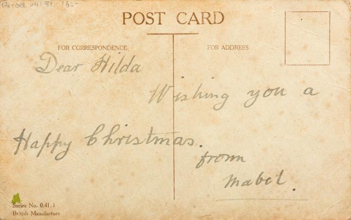 Illustrierte Postkarte (Weihnachten); Grafik, polychrom; Nr. 0.41/1; Rückseite: Weichnachtsmann mit Schreibmaschine, Rundbild mit Mädchen, Kartusche mit Grußtext; Vorderseite beschrieben