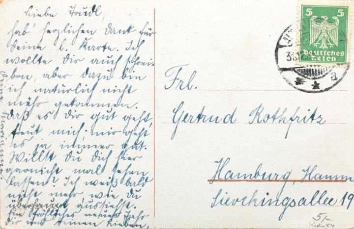 Illustrierte Postkarte; Grafik, polychrom; Nr. 9241/2 Rückseite: vier Wichtel mit Schreibmaschine Vorderseite: beschrieben; adressiert an Frl. Rothfritz, Hamburg; Briefmarke Deutsches Reich 5 RPf.; Poststempel 31.12.1925