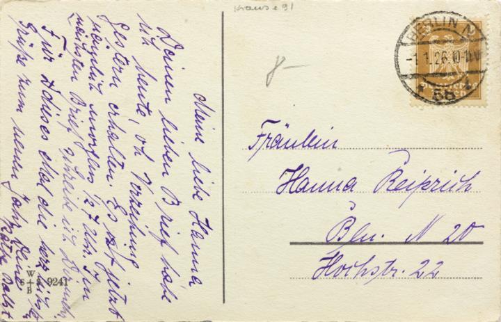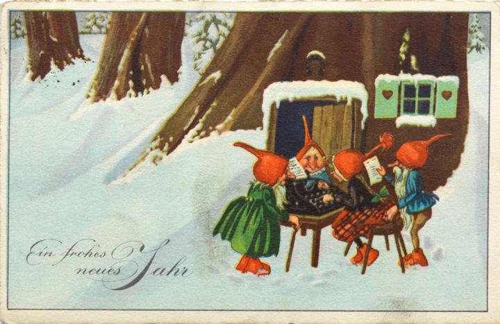 Illustrierte Postkarte; Grafik, polychrom; Nr. 9241; Rückseite: vier Wichtel mit Schreibmaschine Vorderseite: beschrieben; adressiert an Frl. Reiprich, Berlin; Briefmarke Deutsches Reich 3 RPf.; Poststempel 1.1.26
