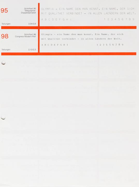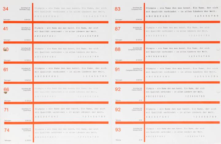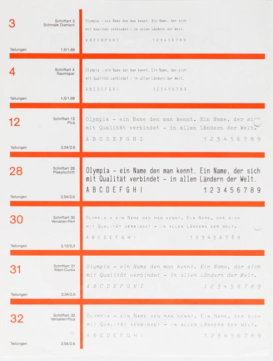 Faltprospekt mit Schriftartenverzeichnis für Schreibmaschine Olympia Nr. 1/13/004/01-1.1.1979
