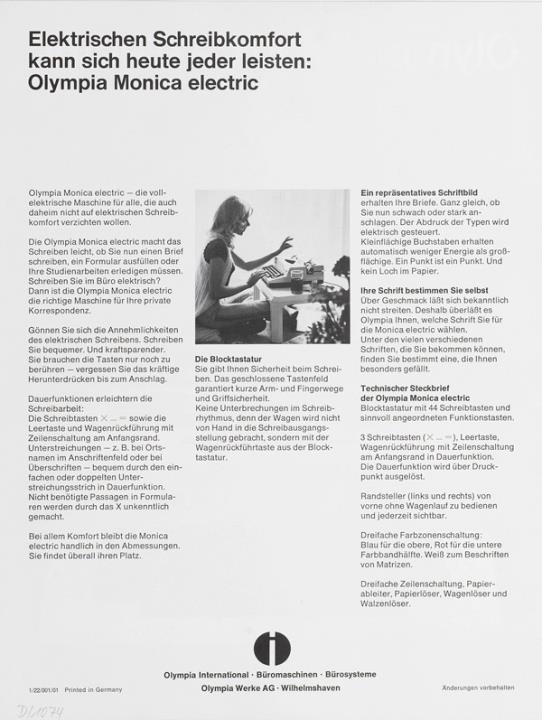 Prospekt für Schreibmaschine Olympia Monica electric Nr. 1/22/001/01