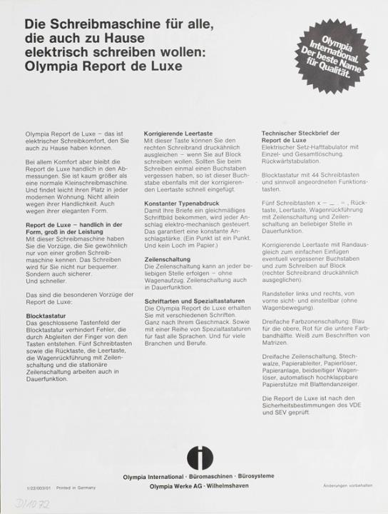 Prospekt für Schreibmaschine Olympia Report de Luxe Nr. 1/22/003/01