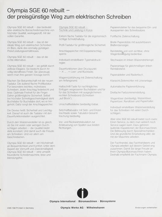 Prospekt für elektrische Schreibmaschine Olympia SGE 60 Nr. VWS 1342