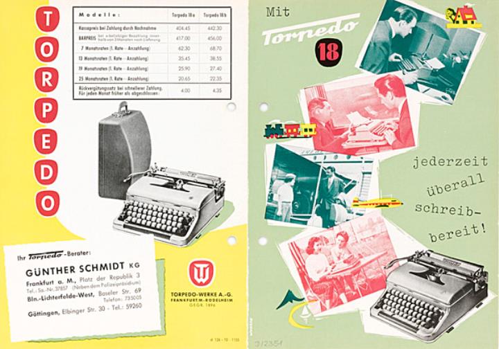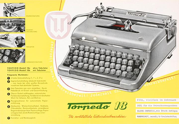 Faltprospekt für tragbare Schreibmaschine Torpedo 18 Nr. d126.10.1155 Grafik: Neudam