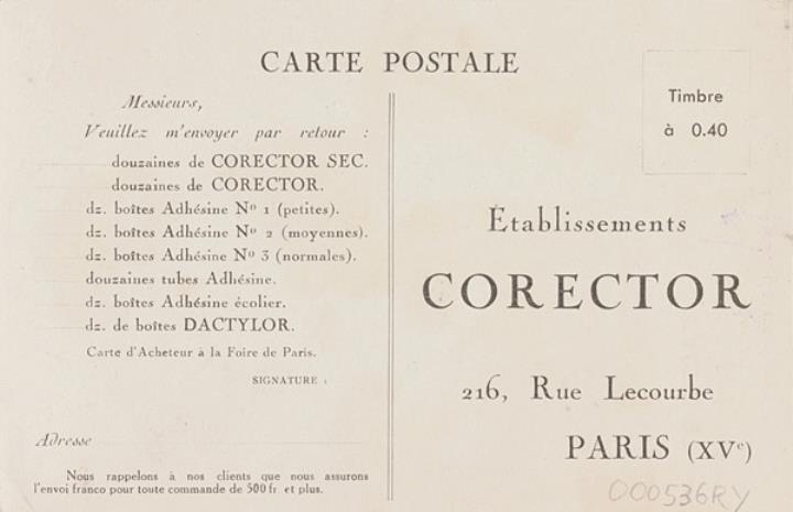 Antwortkarte; Grafik, polychrom Rückseite: Sekretärin mit Tastenreinigungsmittel Dactylor Vorderseite: Bestelltext; vorgedruckte Anschrift Etablissements Corector, Paris