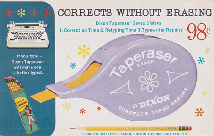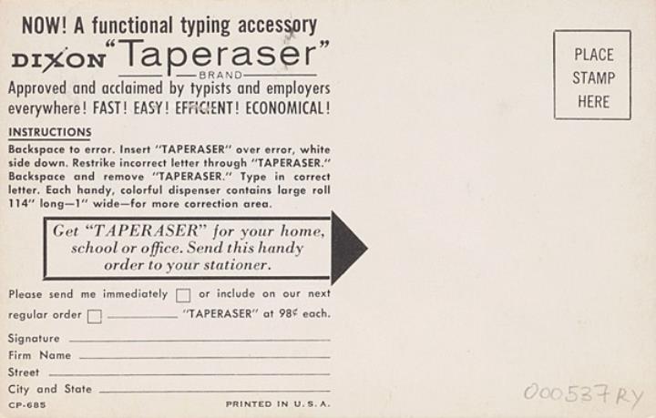 Werbepostkarte; Grafik, polychrom Rückseite: Korrekturroller, Schreibmaschine und Bleistifte Vorderseite: Werbe- und Bestelltext