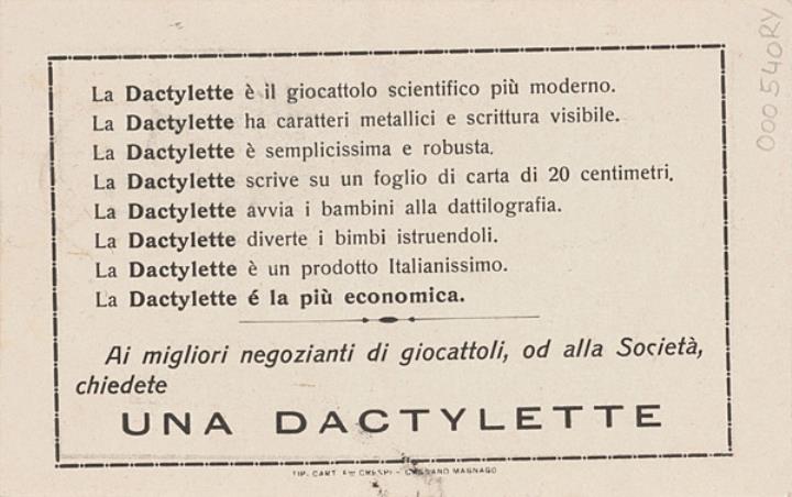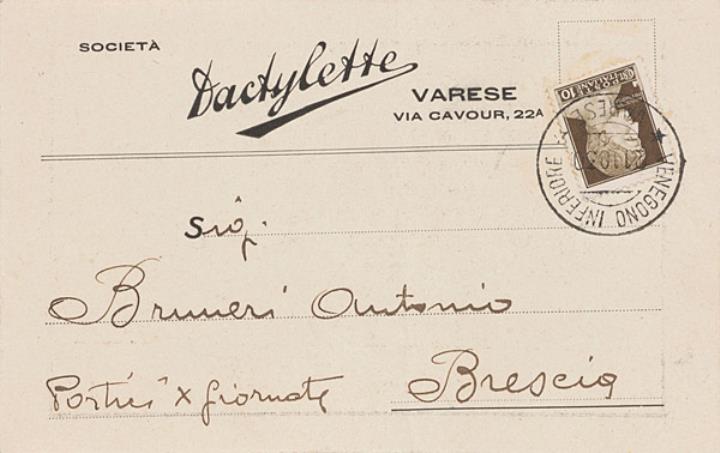 Werbepostkarte; Grafik, monochrom adressiert an Sig. Bruneri, Brescia; Briefmarke Poste Italiane 10 cent.; Poststempel Venegono Inferiore/21.12.1930 mit Werbetext und Abbildungen der Kinderschreibmaschine Dactylette