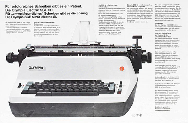 Faltprospekt für elektrische Schreibmaschine Olympia SGE 50 Nr. 1/22/006/01