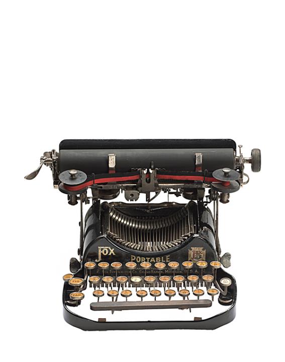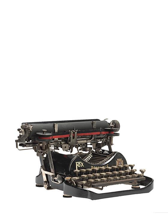 Klappbare Schreibmaschine Fox Portable Eigenschaften: Typenhebel, Vorderanschlag, doppelte Umschaltung, Farbband Tastatur: universal, dreireihig, 31 Schreibtasten Besonderheit: der Wagen klappt nach hinten andere Bezeichnung: Baby Fox, Seriennummer 10340