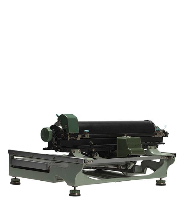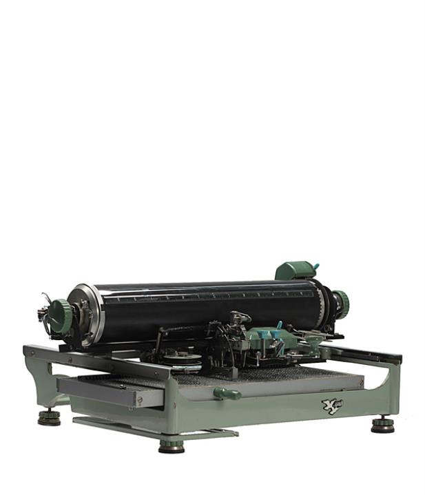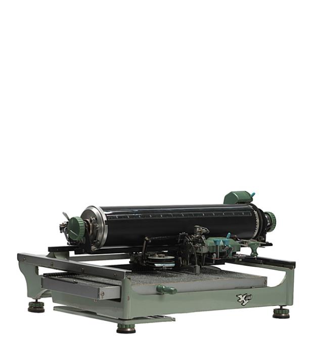Chinesische Schreibmaschine Double Pigeon Modell DHY Eigenschaften: Zeiger, bewegliche Typenplatte mit 70x35 Einzeltypen (Kanji), Vorderanschlag, Karbonband, Farbröllchen Konstrukteur: Sugimoto Kyota, Seriennummer 723514