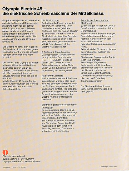 Prospekt für elektrische Schreibmaschine Olympia 45 Nr. 1/22/004/01