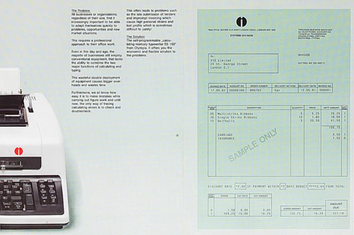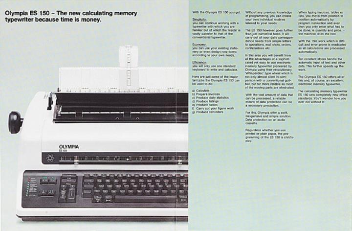Faltprospekt für elektronische Schreib- und Fakturiermaschine Olympia ES 150 Nr. 1/86/023/10