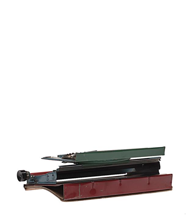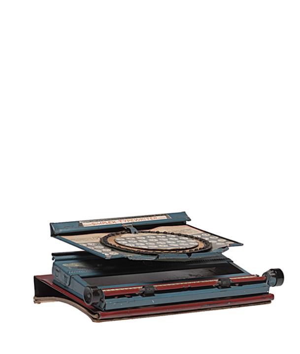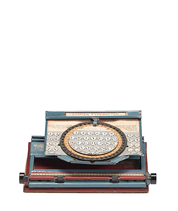 Schreibmaschine Simplex Modell Keyboard 160 Eigenschaften: Zeiger/Eintaster, Typenscheibe aus Gummi, Großbuchstaben, Oberanschlag, Farbkissen, Blendtastatur aus Karton Konstrukteur: Arnaldo Myrthle English, Philip Becker, William John Tompson