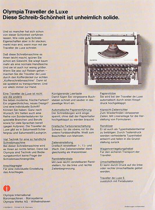 Prospekt für Schreibmaschine Olympia Traveller de Luxe Nr. 1/32/004/01
