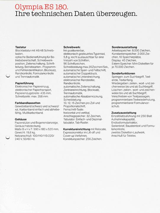Prospekt für Speicherschreibmaschine Olympia ES 180 Die intelligente Alternative Nr. 1/22/019/01