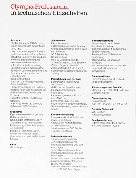 Prospekt für Schreibmaschine Olympia Professional Nr. 1/22/004/01