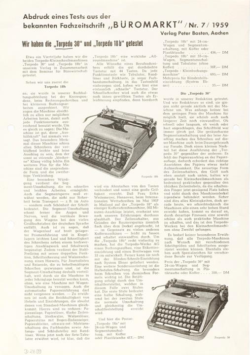 Prospekt für Schreibmaschine Torpedo Abdruck eines Tests aus der bekannten Fachzeitschrift "Büromarkt"/Nr. 7/1959
