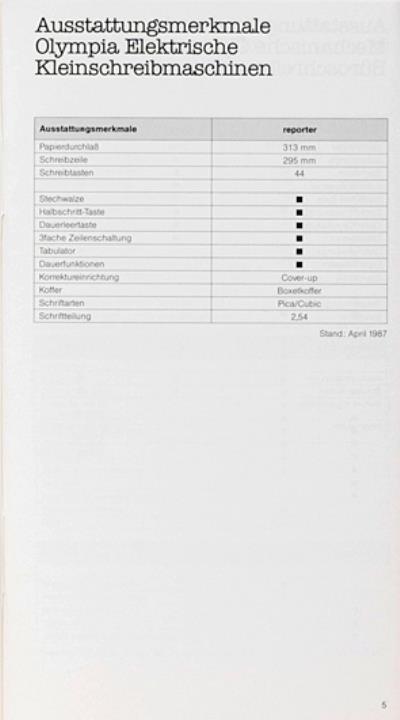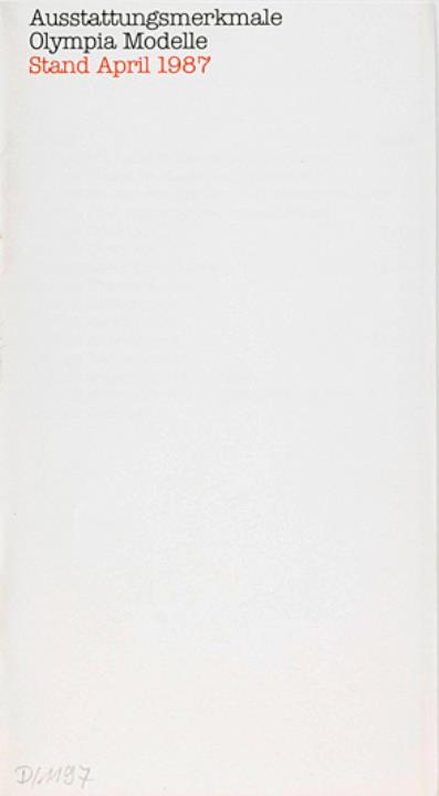 Prospekt mit Ausstattungsmerkmalen und Optionen für Schreib- und Büromaschinen Olympia Stand April 1987 Nr. 5/00 052/01 05.87