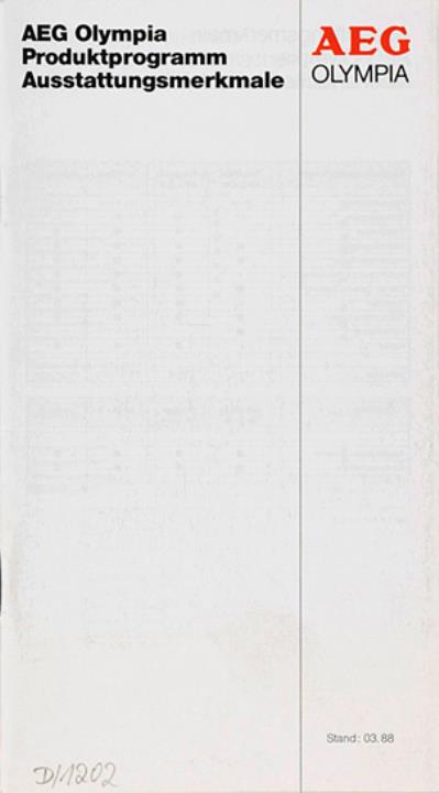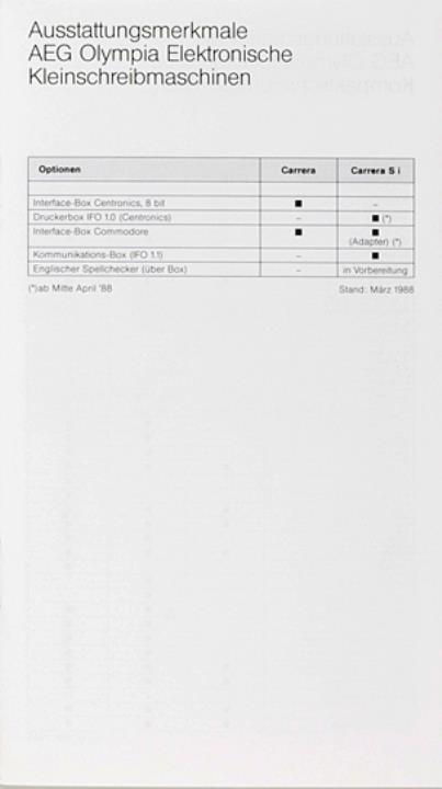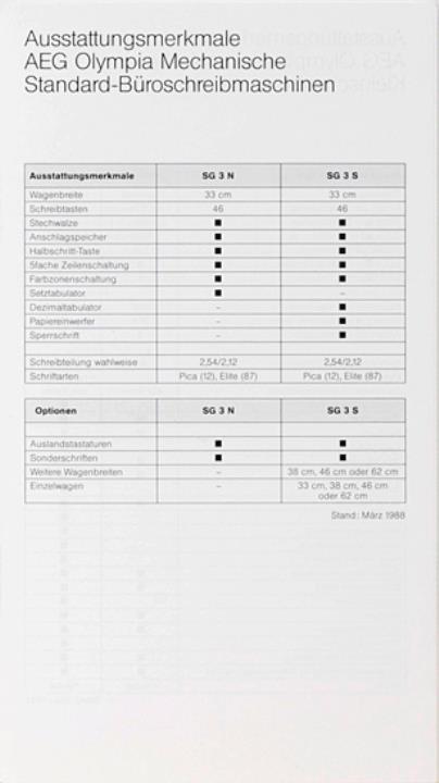 Prospekt mit Ausstattungsmerkmalen und Optionen für Schreib- und Büromaschinen AEG Olympia Stand: 03.88 Nr. 5000 5201 03.88