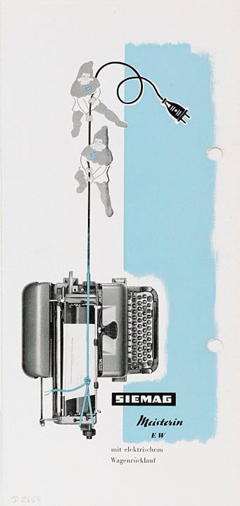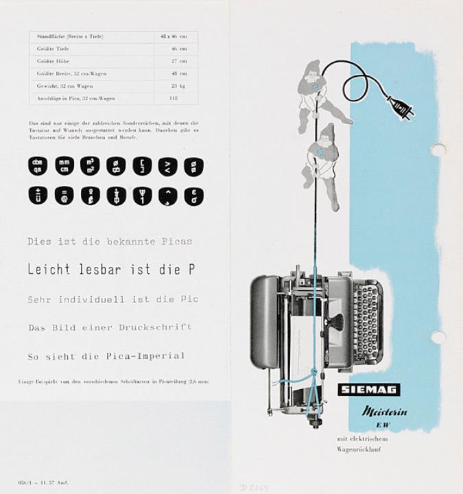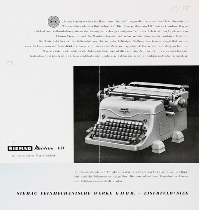 Faltprospekt für Schreibmaschine Siemag Meisterin mit elektrischem Wagenrücklauf und Zeilenschaltung Nr. 056/1-11.57 And.