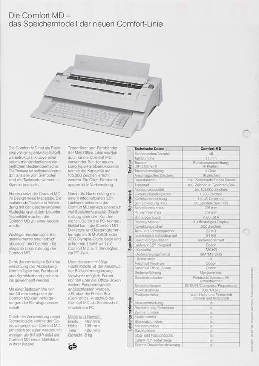 Prospekt für elektronische Schreibmaschine AEG Olympia Comfort MD Nr. 5/111/0801 09.90 WV