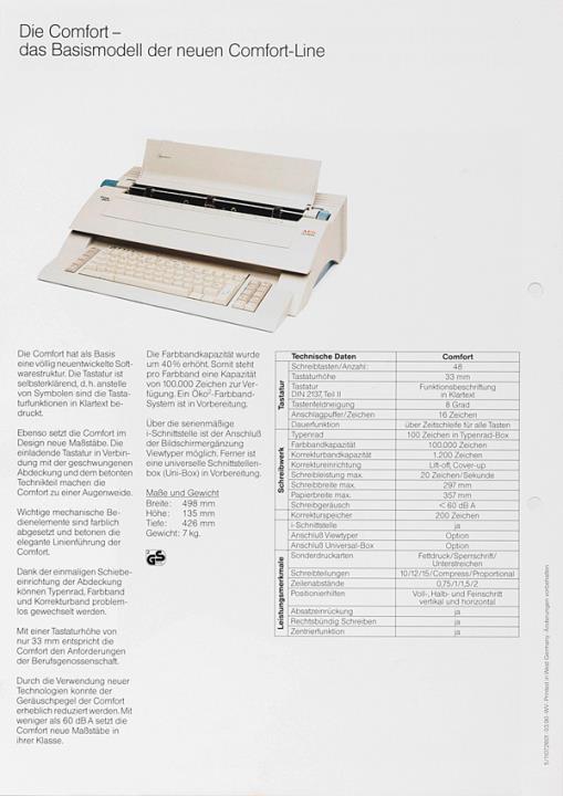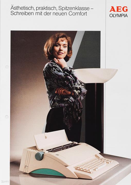 Prospekt für elektrische Schreibmaschine AEG Olympia Comfort Ästhetisch, praktisch, Spitzenklasse Nr. 5/111072601 03.90 WV