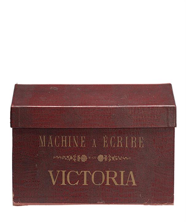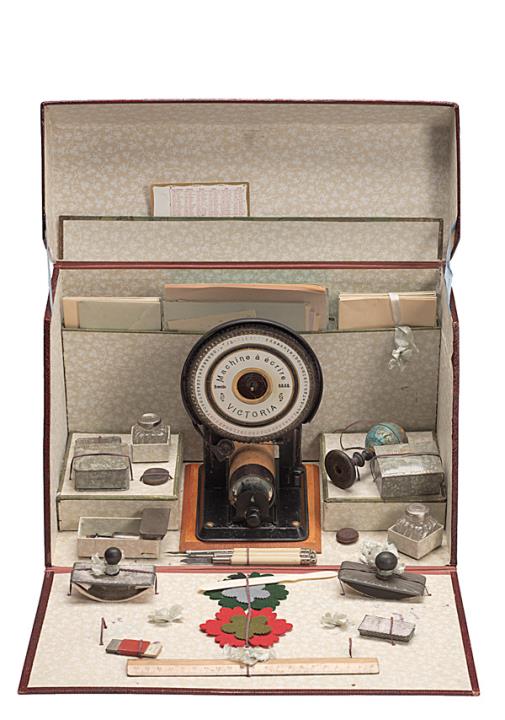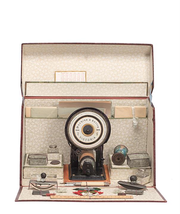 Kinderbüro im aufklappbaren Karton mit Schreibmaschine Victoria (Famos) Inhalt: Zeigerschreibmaschine Victoria, Lineal, 3 Metalldosen eckig, 3 Radiergummi, 2 Löschwiegen, 3 Tintenfässer, Brieföffner, Bleistift, Spitzmesser, Schreibfeder, Globus, Taschenkalender Jahr 1912, leere Schachtel für Stempel, Schachtel mit 3 Federn, 2 Filzblumen, Briefpapier und Briefumschläge Hersteller: W-CO Paris
