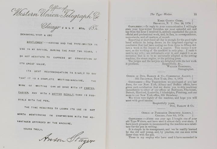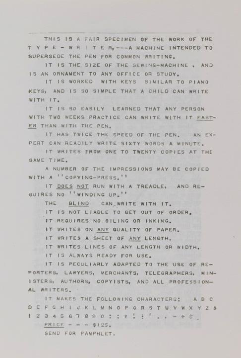 Prospekt für Schreibmaschine The Type-Writer (Sholes & Glidden / Remington) A machine to supersede the pen for manuscript writing Nachdruck, zwei Exemplare (eine fotokopiert, gebunden)