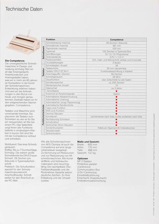 Prospekt für elektrische Schreibmaschine AEG Olympia Competence Nr. 5/111/5301 02.92 WV