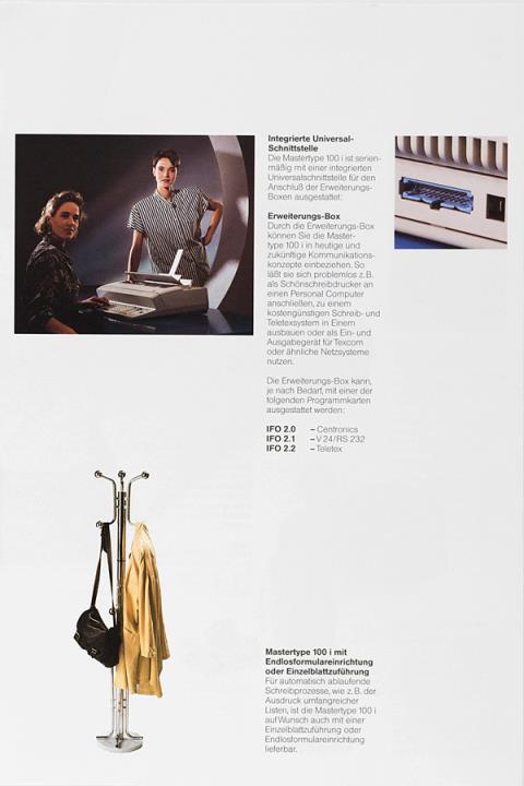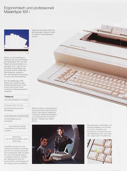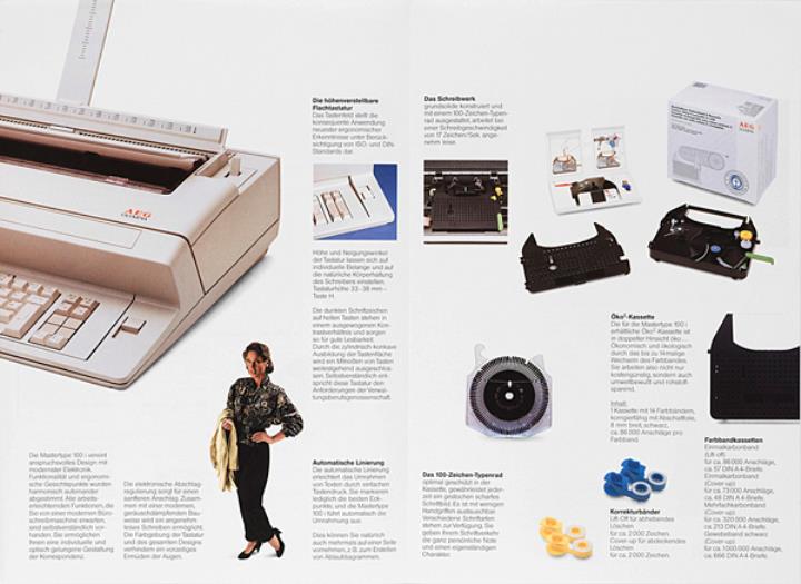 Faltprospekt für elektronische Schreibmaschine AEG Olympia Mastertype 100 i Vorbildliche Ergonomie und professionelle Ausstattung Nr. 5/110/1701 03.90 WV