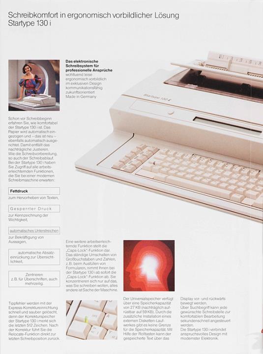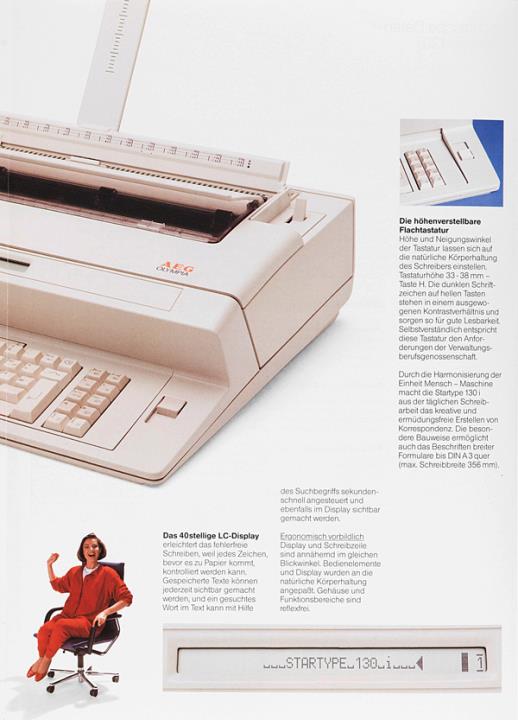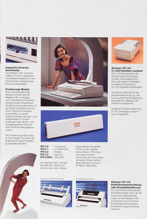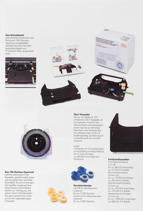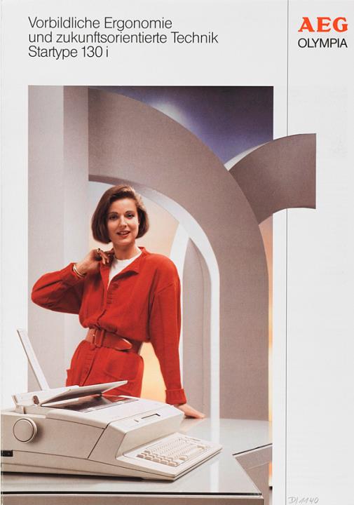 Faltprospekt für elektronische Schreibmaschine AEG Olympia Startype 130 i Vorbildliche Ergonomie und zukunftsorientierte Technik Nr. 5/110/1601 02.90 WV