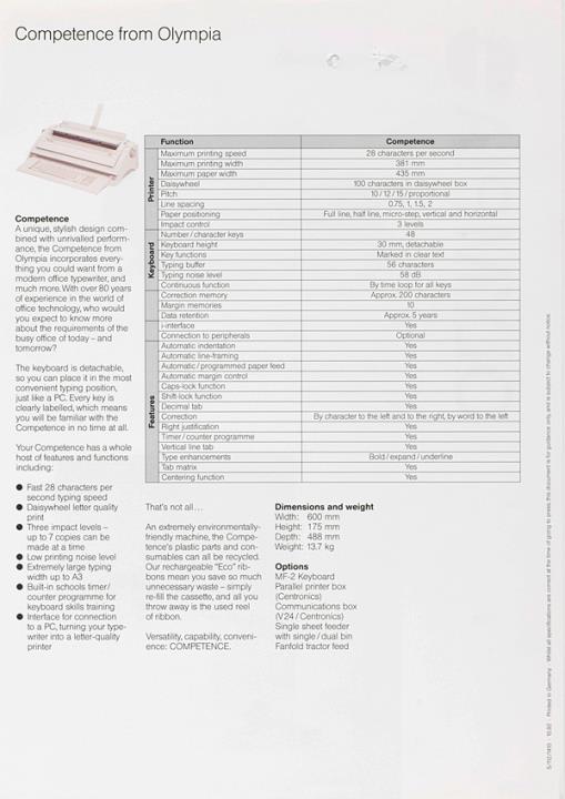 Prospekt in englischer Sprache für elektronische Schreibmaschine Olympia Competence Nr. 5/112/1410 10.92