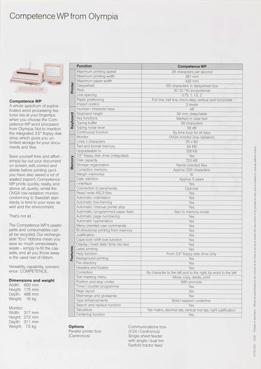 Prospekt in englischer Sprache für Bildschirm-Schreibmaschine Olympia Competence WP Nr. 5/112/3210 10.92