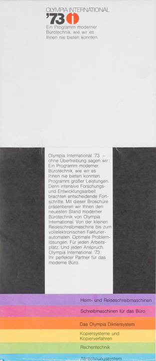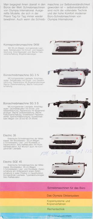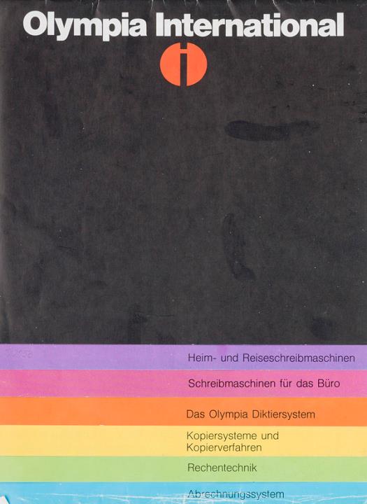 Prospekt für Schreib- und Büromaschinen Olympia Heim- und Reiseschreibmaschinen, Schreibmaschinen für das Büro, Das Olympia Diktiersystem, Kopiersysteme und Kopierverfahren, Rechentechnik, Abrechnungssystem Nr. 1/01/002/01