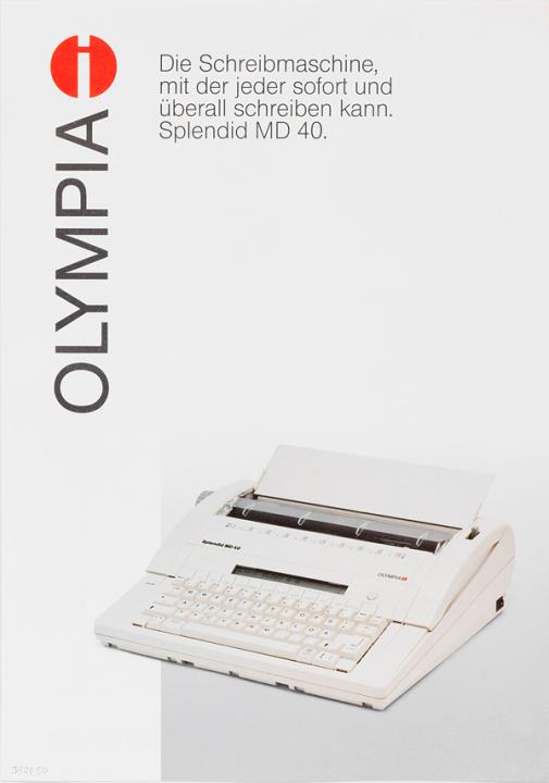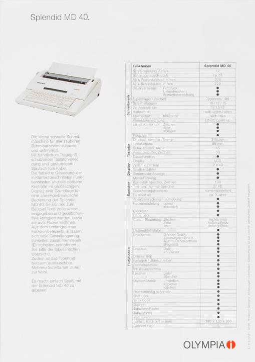 Prospekt für elektronische Schreibmaschine Olympia Splendid MD 40 Die Schreibmaschine, mit der jeder sofort und überall schreiben kann Nr. 5/112/5101 02.96