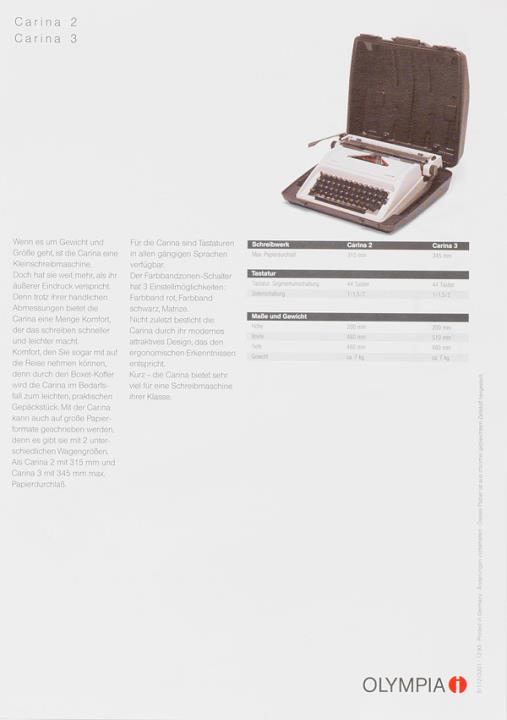 Prospekt für Schreibmaschine Olympia Carina 2, Carina 3 Die Kleinschreibmaschinen mit großem Komfort Nr. 5/112/3301 12.93